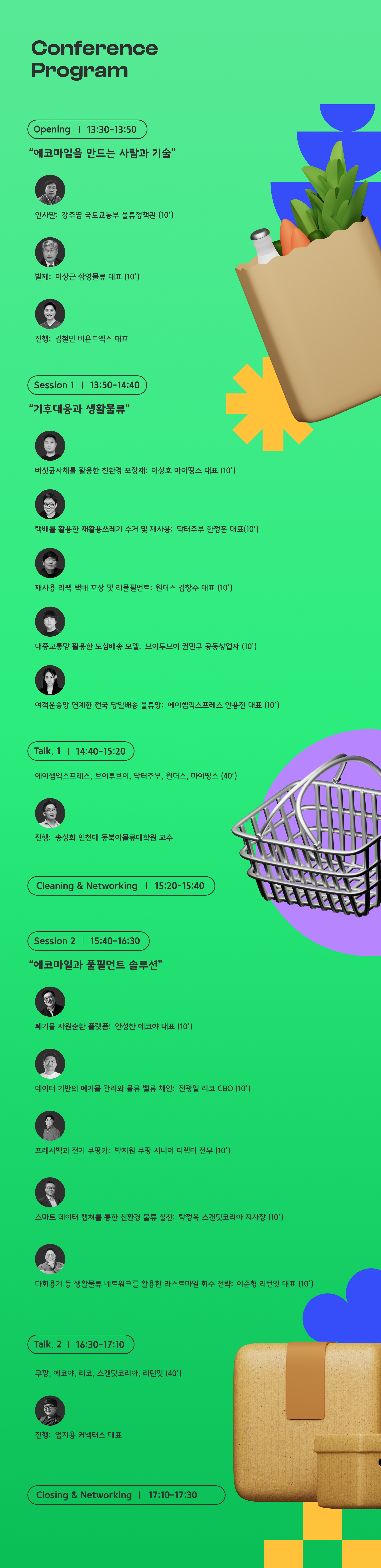 쓰레기 분리수거와 폐기물 자원순환 활동이 처음으로 이뤄지는 주거반경 1.6km 구간인 ‘에코마일(eco-mile, last-mile+ecosystem)’을 알리고, 배송 및 반품, 회수, 포장재 개발 등 다양한 친환경 물류 서비스를 제공하는 기업들이 함께 모여 정보를 공유하는 네트워킹 데이가 열린다.