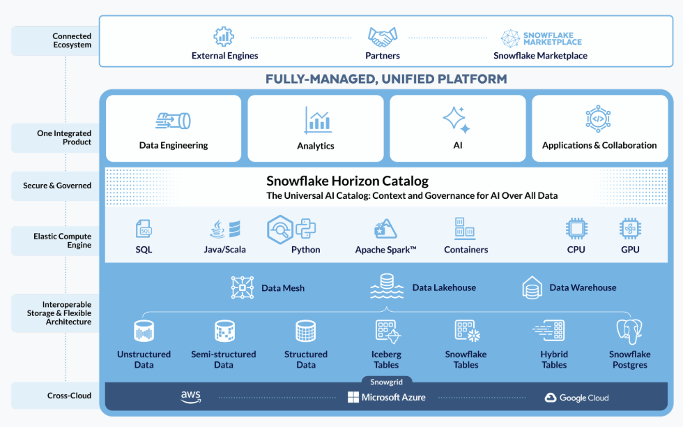 즉, 스노우플레이크는 단순한 데이터 저장소가 아니다. 데이터를 중심으로 조직 전반의 의사결정과 운영, AI 혁신을 촉진하는 데이터 허브다.
