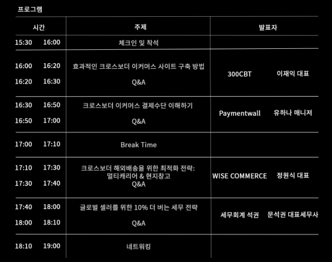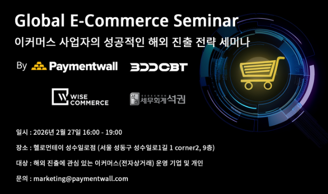 글로벌 결제 플랫폼 Paymentwall과 300CBT, 와이즈커머스, 세무회계 석권이 공동 주최하는 이번 행사는 해외 진출을 준비 중이거나 이미 크로스보더 판매를 운영 중인 사업자를 대상으로, 국가별 결제 선호도와 체크아웃 설계, 글로벌 정산 및 리스크 관리, 물류비 최적화 전략, 부가세(VAT)와 통관 이슈 대응까지 실무 전반을 다룬다.