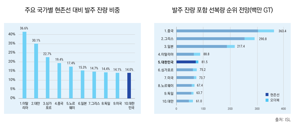 문제는 신조 발주 부진으로 이러한 격차가 더욱 벌어질 가능성이 높다는 점이다. 한국의 발주 잔량(Order Book)은 900만 GT로 현존선(7,140만 GT)의 12.6%에 불과해 주요 10개국 중 최하위를 기록했다. 이탈리아(36.6%), 대만(30.1%), 싱가포르(22.7%)는 물론 일본(15.3%)에도 크게 뒤진다. 발주 잔량을 포함한 잠재 선복량 기준으로는 한국이 5위로 밀려날 것으로 전망되며, 일본과의 격차는 현재 2.5배에서 2.7배로 다시 확대될 것으로 보인다.