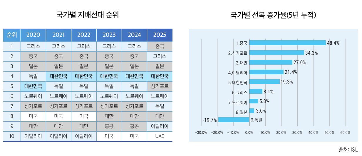 한국은 2021년 독일을 제치고 4위로 상승한 이후 이 위치를 유지하고 있지만, 절대 규모 면에서는 상위권과의 격차가 여전히 크다. 2025년 기준 한국의 선복량은 7,150만 GT로 전체 시장 점유율 4.4%에 그치는 반면, 일본(1억 8,850만 GT, 11.1%)과는 2.5배, 그리스(3억 1,840만 GT, 18.4%)와는 4.5배의 격차를 보인다. 더 우려스러운 것은 성장 속도다. 2020년부터 2025년까지 5년간 한국의 선복량 증가율은 19.3%로 아시아 경쟁국인 중국(48.4%), 싱가포르(34.3%), 대만(27.0%)에 크게 뒤처진다.