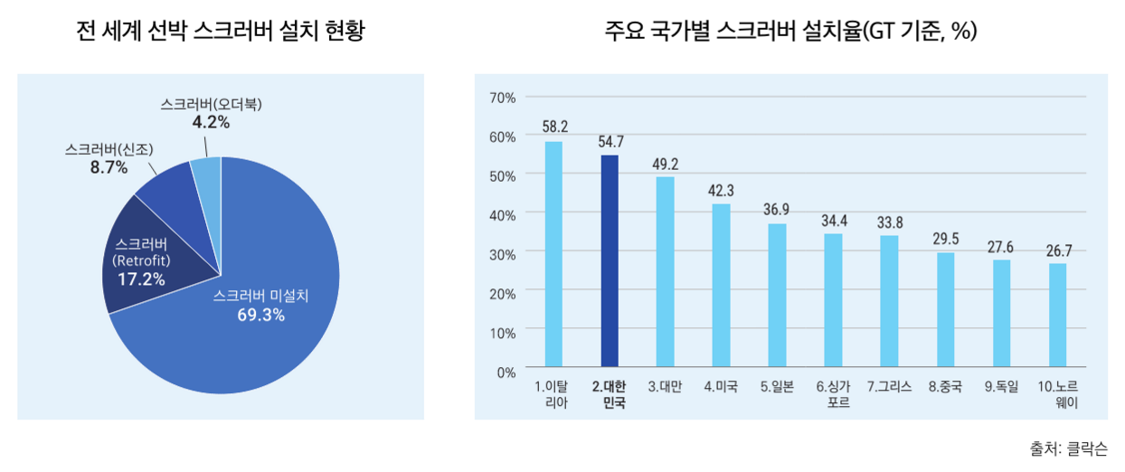 그러나 친환경 전환 측면에서는 한국이 세계 최상위권 경쟁력을 확보하고 있다는 점이 주목할 만하다. 특히 SOx(황산화물) 저감장치인 스크러버(Scrubber) 보급에서 한국은 톤수 기준 54.7%의 장착률로 글로벌 평균 30.1%의 1.8배 수준을 기록하며 세계 2위를 달성했다. 이는 해양수산부와 한국해양진흥공사의 정책금융 지원이 주효했던 결과다. 2019년부터 2024년까지 친환경설비개량 이차보전 사업으로 229대에 300억 원을 지원했고, 특별보증으로 5,792억 원의 보증을 실행했다.