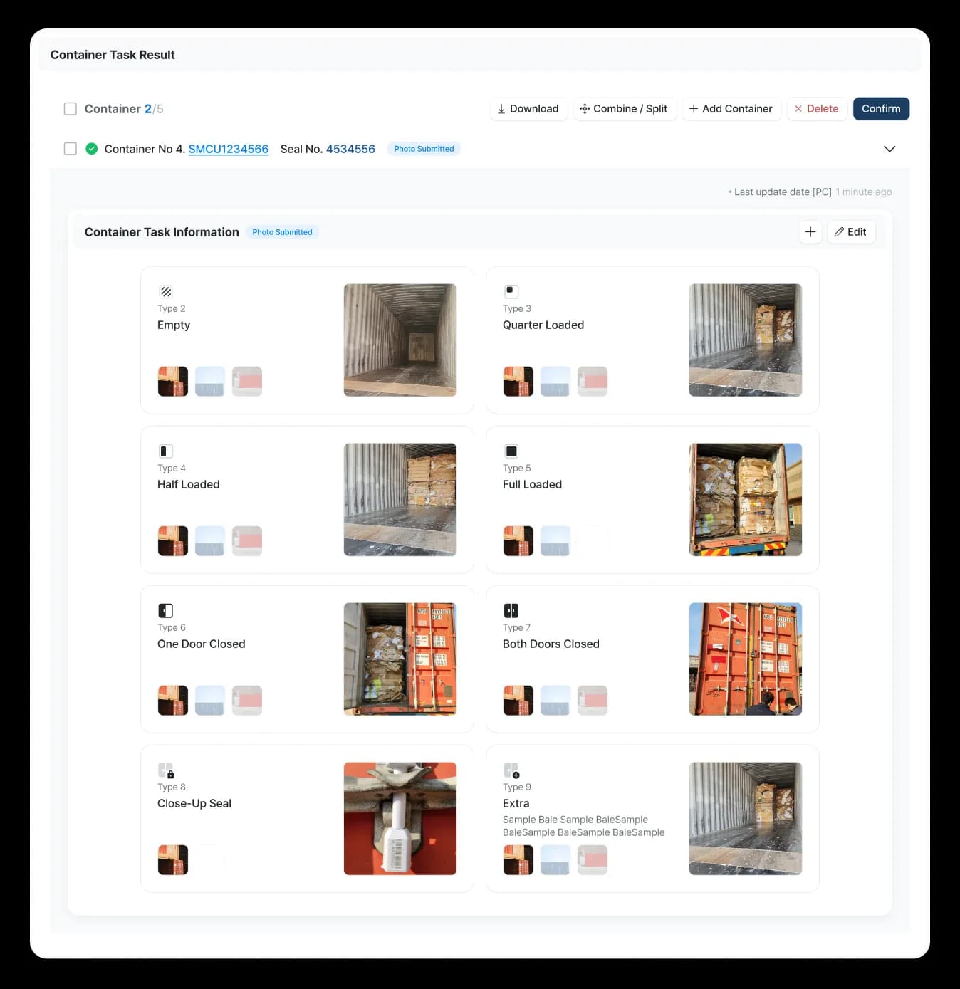 현장 작업자가 앱을 켜고 작업 코드를 입력한다. 컨테이너 번호판에 카메라를 갖다 대면 OCR(Optical Character Recognition·광학 문자 인식)이 읽는다. 수기 입력 없다. 오타 없다. 단계별 촬영 가이드가 나온다. 빈 컨테이너, 1/4 적재, 반 적재, 완전 적재, 도어 클로즈, 씰 클로즈업. 가이드 순서대로 찍으면 된다.