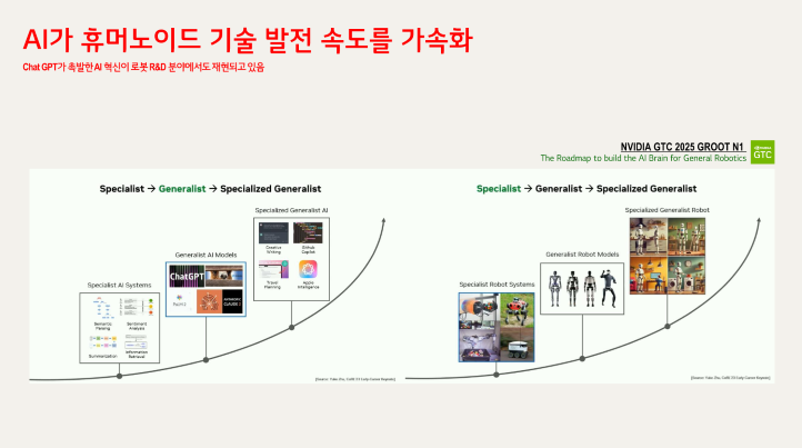 오른쪽: 로봇의 진화Specialist Robot Systems → Generalist Robot Models → Specialized Generalist Robot (휴머노이드 로봇)