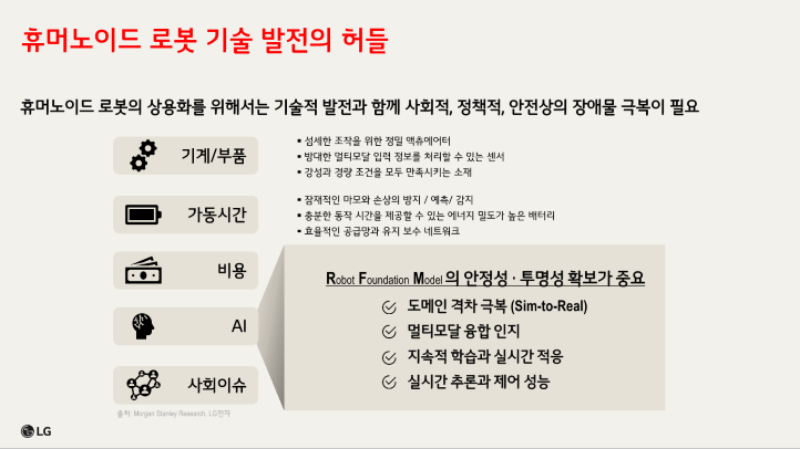Sim-to-Real Gap, 즉 시뮬레이션과 현실의 차이를 극복해야 합니다. 시각+청각+촉각의 멀티모달 융합 인지, 실시간 학습과 적응도 필요합니다. 현재는? 제한적 상황에서만 작동합니다.