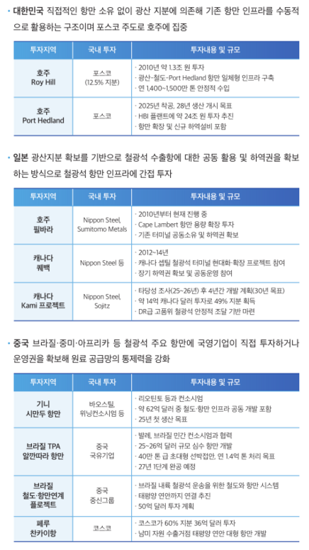 문제는 이러한 집중 구조가 단순히 무역 통계상 수치에 그치지 않고, 실제 물리적 인프라에 대한 통제력 부족으로 이어진다는 점이다. 철광석의 경우 한국 기업들은 포스코의 호주 로이힐(Roy Hill) 광산 지분 12.5%(약 1조 8,200억 원, 약 1.3조 원 투자) 등 일부 광산 지분을 확보했지만, 주요 선적항인 포트헤들랜드(Port Hedland), 투바라오(Tubarao) 등은 현지 광산업체(BHP, Vale)가 운영을 주도하며 한국은 선적 우선권 같은 직접적 통제력을 갖지 못한다.