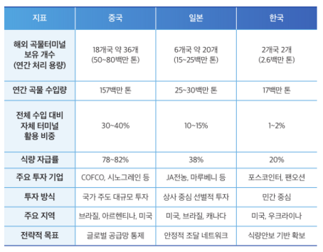 이는 일본, 중국과 극명한 대조를 이룬다. 일본은 1970년대부터 식량안보를 국가 생존과 직결된 전략자산으로 간주하고 민관협력을 통해 해외 곡물 인프라 확보에 집중해왔다. 전국농업협동조합연합회(JA전농, Zen-Noh)와 종합상사가 역할을 분담(30:70)하여 곡물 메이저를 배제한 독자적 조달체계를 구축했는데, JA전농은 1978년 젠노 그레인(Zen-Noh Grain)을 설립하고 1988년 미국 CGB를 인수해 미시시피강 유역 엘리베이터 12개소(연 500만 톤 처리)를 운영하며 미국산 곡물 안정적 확보 기반을 마련했다. 2024년에는 번지와 합작해 브라질 산토스항 곡물 터미널 지분 50%를 인수하며 남미 조달선 다변화에도 나섰다.