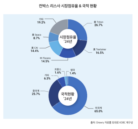 컨테이너 박스 시장은 더욱 집중된 구조다. 전 세계 컨테이너 박스 생산량의 98% 이상을 중국이 차지하며, 중국 상위 3개사(CIMC 40.5%, DFIC 27.2%, CXIC 9.9%)의 제조량이 78%에 달한다. CIMC와 DFIC는 중국 정부가 직·간접 소유하는 회사로, 중국 컨테이너 협회를 통해 타 제작사에 강한 영향력을 미친다. 리스 시장은 미국계(65%)와 중국계(26%)가 양분하는데, 상위 5개사(Triton 26.7%, Textainer 16.5%, Florens 14.5%, CAI 14.4%, Seaco 8.7%)가 80.7%를 차지한다. 한국에는 해상 운송용 일반 컨테이너 박스 제조 기업이 전무하며, 리스사는 CALT(한국도심공항)가 약 5,000 TEU 규모로 사업을 영위하다 최근 축소 단계다.