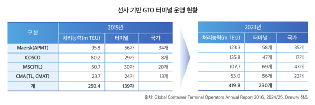 반면 글로벌 GTO 시장은 선사 주도 GTO의 부상, 재무적 투자자(FI)의 공격적 진입, 신흥 GTO의 공급망 통합 전략 등으로 급속히 재편되고 있다. 2023년 기준 상위 4대 선사(Maersk/APMT, MSC/TIL, CMA/Terminal Link, COSCO)가 운영하는 항만 처리능력은 420백만 TEU로 전 세계의 32.6%를 차지한다. 이는 2015년 250백만 TEU(25.4%)에서 68% 증가한 수치다. 선사들은 단순한 수익 창출을 넘어, 운항 안정성 확보, 네트워크 최적화, 항로 주도권 확보를 위한 전략적 인프라 투자를 통해 서비스 차별화→운임 결정력 강화의 선순환 구조를 구축하고 있다.