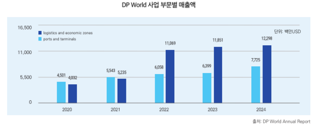 신흥 GTO의 부상은 더욱 전략적이다. AD Ports(UAE), China Merchants Ports(중국), Adani Ports(인도) 등은 국가 전략·정책금융·국영기업 자본을 기반으로 항만-내륙철도-특구(Free Zone)-디지털까지 연계한 공급망 통합 전략을 구사한다. DP World는 2020년 피더선사 인수, 창고·3자물류 확장, 산업단지 개발, 글로벌 FI 파트너십을 통해 사업 부문별 매출을 2020년 45억 달러(항만 터미널)에서 2024년 123억 달러(77억 달러 터미널, 46억 달러 물류·경제특구)로 확대했다. Adani Ports는 인도 정부의 수출 기반 확대 정책과 연계해 인도 내 컨테이너 물동량의 25%를 확보하고, 항만+물류+철도+배후산업단지+에너지까지 통합 개발하며 중동·아프리카·스리랑카로 확장하고 있다.