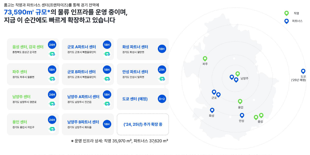 2024년 기준, 품고는 직영과 파트너 센터를 포함해 73,590㎡ 규모의 물류 인프라를 운영 중이며, 2025년까지 추가 확장을 계획하고 있습니다.